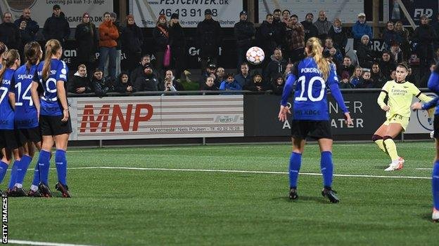 Before the halftime, Catley scored a free-kick into the top corner to put Arsenal ahead of the Danish champions.